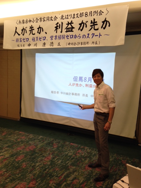 2014年8月29日 / 最終更新日時 : 2014年8月29日 管理者 税務情報 但馬例会にご参加ありがとうございました(^・^) 先日行われた但馬8月例会ですが、大盛況?!で幕を閉じました(^・^) ご参加いただいた方には本当に感謝しております。 まだまだ、経営者としては未熟な私ですが、この同友会のおかげで尊敬できる経営者に巡り合え 事務所経営に対して真剣に取り組むようになれました。 もし何年か後に再び例会発表の場をいただけるのなら、何段階もステップアップした中川会計事務所を 披露できればいいですね! Follow me!